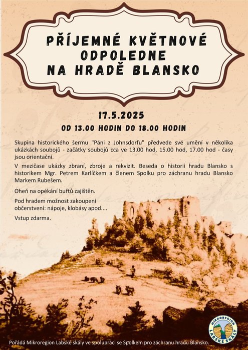 Mikroregion Labské skály ve spolupráci se Spolkem pro záchranu hradu Blansko představí dne 17.05.2025 od 13 do 18:00 skupinu historického šermu "Páni z Johnsdorfu", vč. ukázky zbraní, zbroje a rekvizit. Více o historii hradu se dozvíte při besedě s historikem Mgr. P. Karlíčkem a členem Spolku pro záchranu hradu Blansko p. M. Rubešem. Více informací naleznete v příloze.