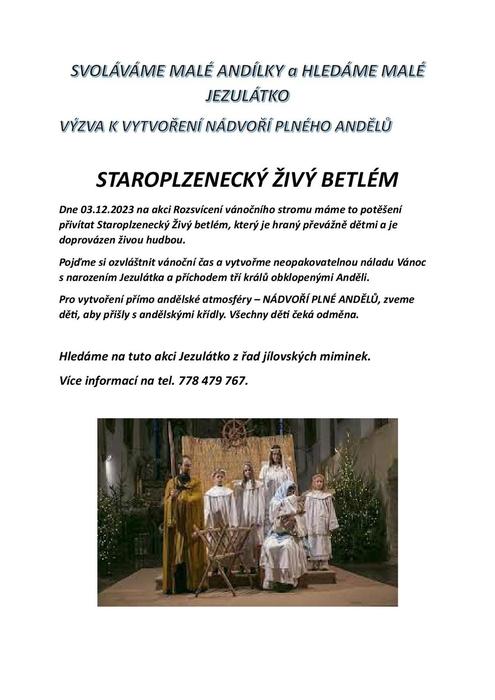 Na neděli 03.12.2023 na akci Rozsvícení vánočního stromu přivítáme Staroplzenecký Živý betlém, který je hraný převážně dětmi a je doprovázen živou hudbou. Pojďte si s námi ozvláštnit vánoční čas a vytvořit neopakovatelnou náladu Vánoc s narozením Jezulátka a příchodem tří králů obklopenými Anděli.