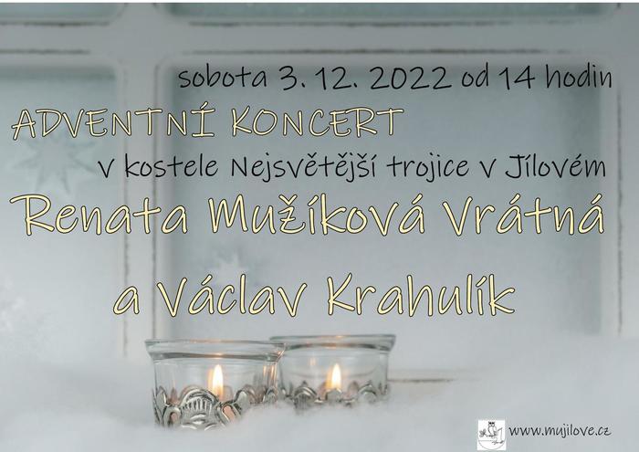 V sobotu 03.12.2022 od 14 hodin se koná Adventní koncert v kostele Nejsvětější trojice v Jílovém. Koncertuje Renata Mužíková Vrátná a Václav Krahulík.
