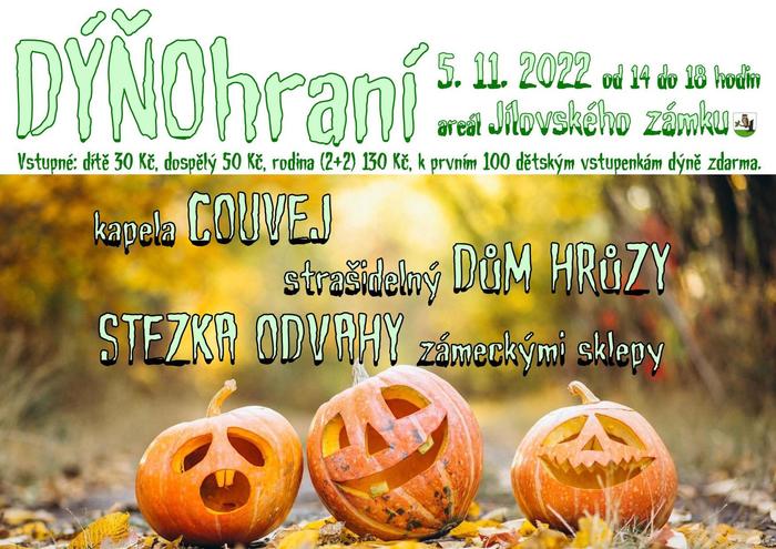 V sobotu 05.11.2022 od 14 do 18 hod. se koná v areálu Jílovského zámku každoroční Dýňohraní. Od 20 hod. se můžete pobavit a zatančit si s kapelou MIX 77. Viz přílohy.