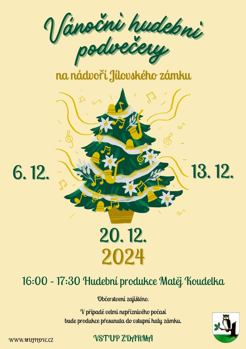Hudební produkce Matěje Koudelky budou probíhat na nádvoří Jílovského zámku v pátek 06.12.2024 od 16 do 17.30 hod. Občerstvení pro vás bude zajištěno. V případě velmi nepříznivého počasí bude produkce přesunuta do vstupní haly zámku.