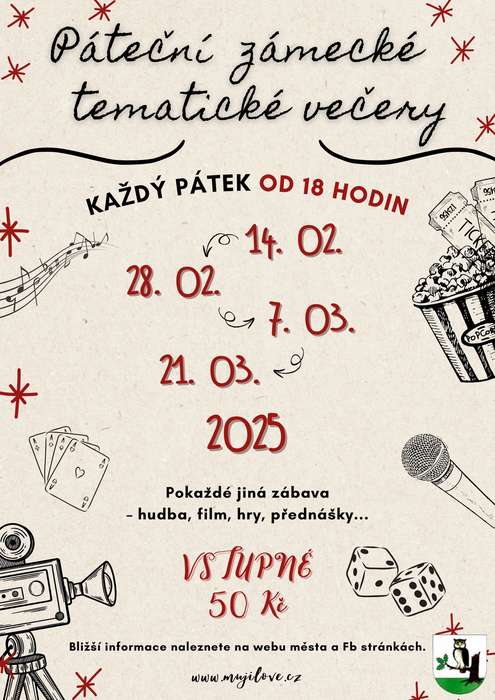 I v únoru pokračujeme pátečními zámeckými tematickými večery - 14.02.2025 od 18:00 (viz příloha). Pokaždé jiná zábava (hudba, film, hry, přednášky...). Bližší informace vždy průběžně naleznete na webu nebo FCB města.