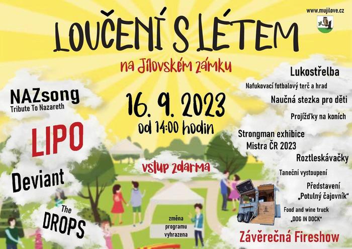 Tradiční "Loučení s létem" se opět koná v areálu Jílovského zámku dne 16.09.2023 od 14:00. Připravena bude lukostřelba, Strongman exhibice, naučná stezka pro děti a mnoho dalšího... V průběhu dne zahraje NAZsong "Tribute To Nazareth", LIPO, Deviant a The Drops. Akci ukončí fireshow. Program akce viz níže.