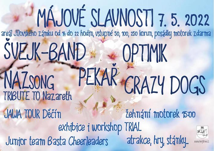 V sobotu 07.05.2022 vás zveme na MÁJOVÉ SLAVNOSTI do areálu Jílovského zámku. Vystoupí ŠVEJK-BAND s písničkami z hospůdek kabaretů a šantánů, pop rocková kapela OPTIMIK, NAZsong TRIBUTE TO Nazareth, kapela PEKAŘ a na závěr kapela CRAZY DOGS, která vás nenechá v klidu sedět a strhne vás v rytmu rock and rollu. Také je připraven exhibiční program i workshop TRIALSHOW, odpoledne budou k vidění motocykly JAWA TOUR Děčín, a k večeru další exhibiční vystoupení Junior teamu Basta Cheerleaders z. s. (mnohonásobného Mistra ČR, Mistra Evropy a účastníka soutěže Československo má talent). Chybět nebudou hry, soutěže a atrakce pro děti. Pokud vyjde počasí, můžete ochutnat rolovanou zmrzlinu… Zveme i všechny motorkáře a jejich nablýskané miláčky (v 15.00 hod. plánujeme žehnání motorek). Více naleznete v příloze a v programu.