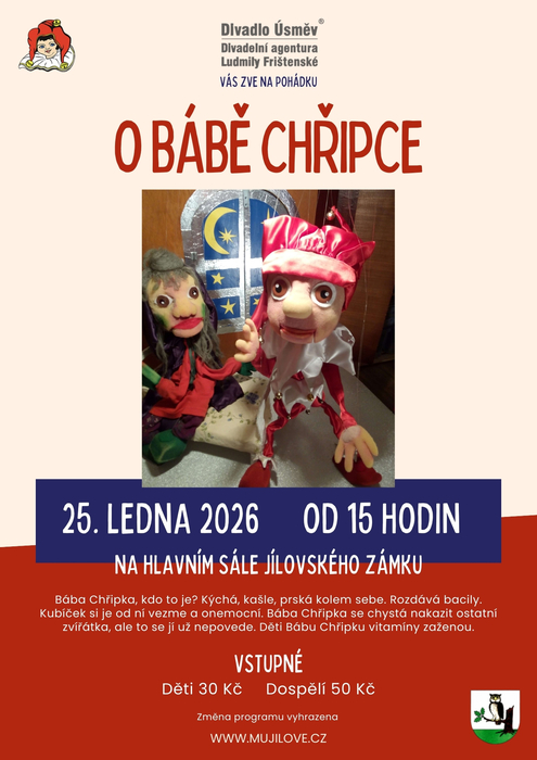 První pohádkou roku 2026 bude O Bábě Chřipce od 15:00 na hlavním sále zámku od divadelní agentury Ludmily Frištenské. Bába Chřipka, kdo to je? Špinavá, umazaná, roztrhaná, ošklivá. Kapesník má samý bacil. V kapse bacil angíny, kašle, teploty. Nabízí je jako dobroty. Až potká Kubu co si vezme od ní dobroty-bacili. A hned má teplotu a chřipku. Zdravěnka ho uloží do postele a jde mu pro vitamíny. Bába Chřipka, když slyší nebo vidí vitamíny, tak se jí to nelíbí. Vstupné 30 Kč dítě, dospělí 50 Kč.