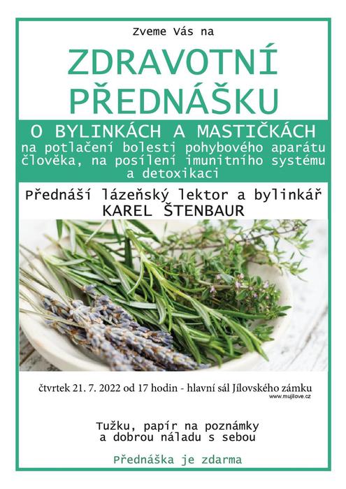 Ve čtvrtek 21.07.2022 od 17 hod. se na Jílovském zámku koná zdravotní přednáška O BYLINKÁCH A MASTIČKÁCH (přednáší lázeňský lektor a bylinkář Karel Štenbaur). Více naleznete v příloze.